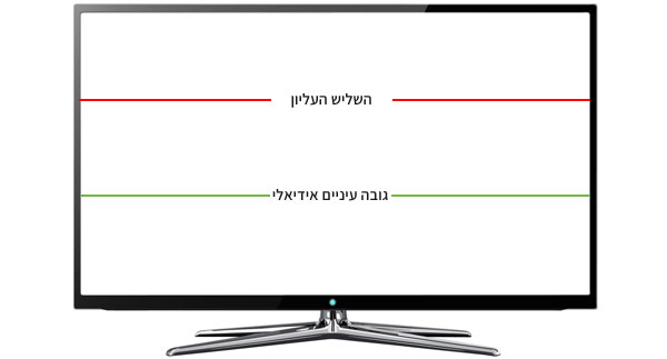 על מנת לקבל את התוצאה הטובה ביותר יש "לחלק" את הטלויזיה ל-3 חלקים (לרוחב). ניתן לסמן באמצעות מדבקה לנוחות. כעת שבו על הספה בסלון - אם גובה העיניים שלכם מגיע לחלקו העליון של השליש התחתון של הטלוויזיה זהו הגובה האידאלי בעבורכם. בדרך כלל הוא גובה תליית טלוויזיה על קיר בסלון מסתכם ב80 עד 90 ס"מ מהרצפה. |