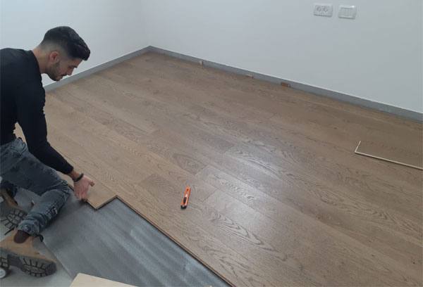ביצוע התקנת פרקט על ריצוף קיים כולל שימוש בחומר בידוד בין הריצוף והפרקט.